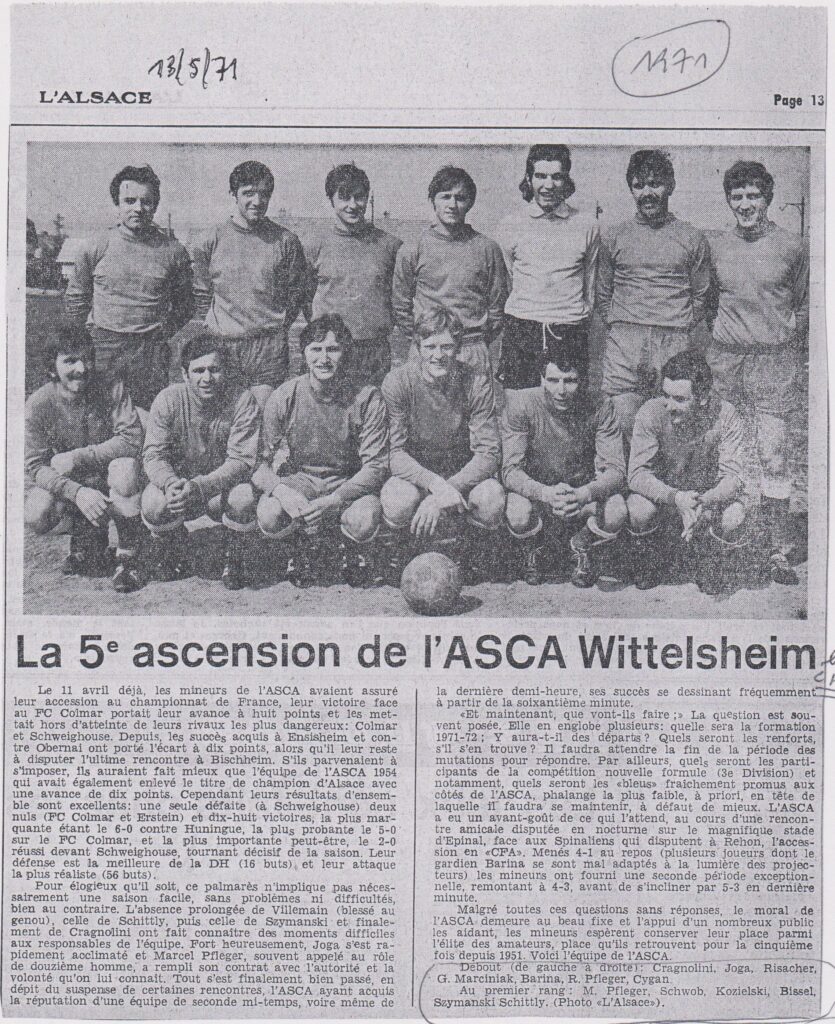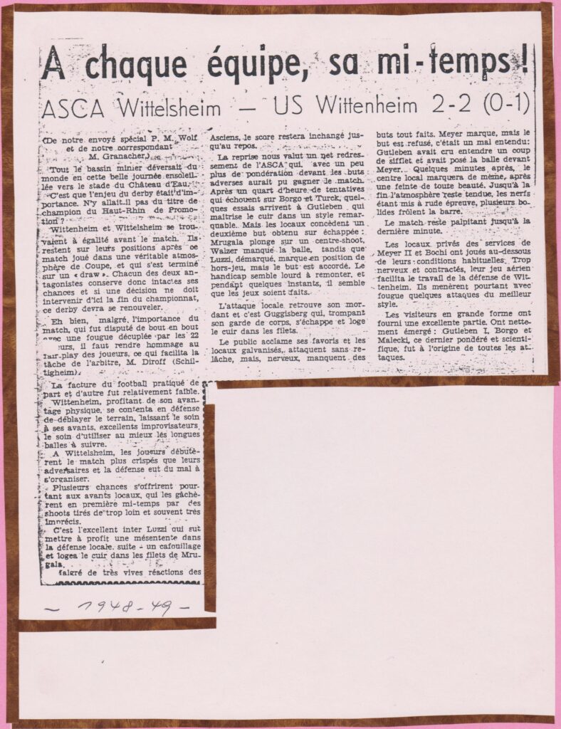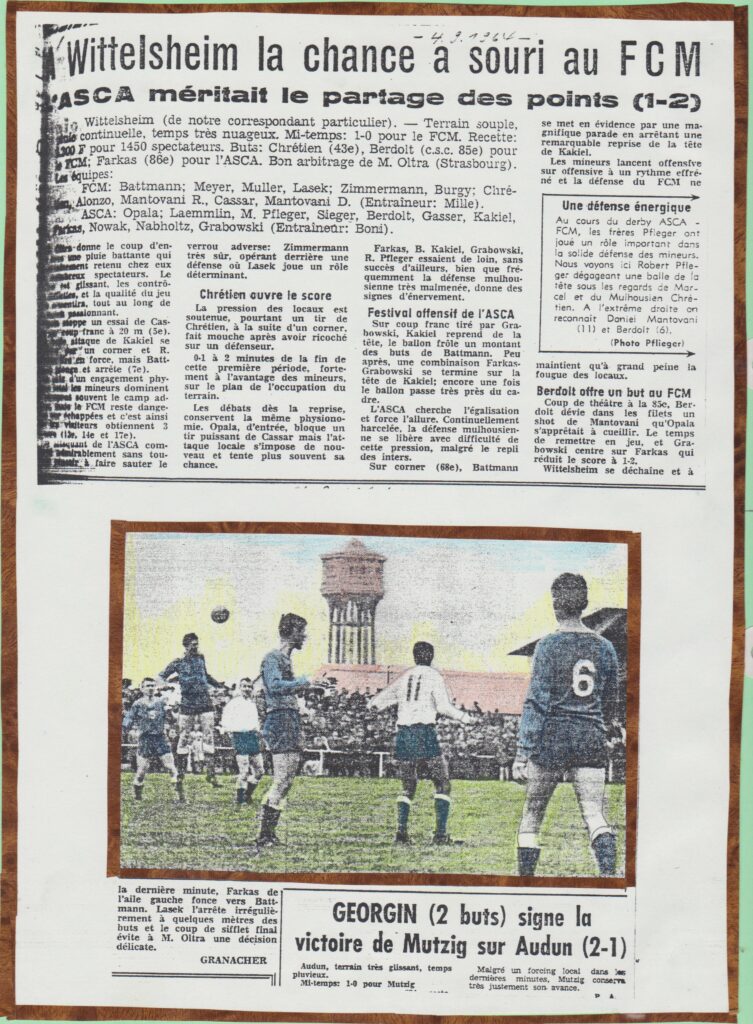 34. On ne peut quitter ce sujet du jour sans un mot sur ce qui pouvait être l’ambiance au stade du Château d’eau, quand l’équipe-fanion du club des mineurs s’y produisait le dimanche après midi ; c’est, devinez qui ? Granach’ qui annonçait au micro de la tribune la composition des équipes; pour « chauffer » un peu les spectateurs, il ne passait sur disques que des airs militaires, ce qui permettait à l’Asca d’échapper à la taxe de la Sacem sur les droits d’auteur ; dans les années 50, le curé (dit « français », par rapport à l’autre, le nôtre, le « polonais », Joseph Litschgy, (qui m’a baptisé, ledit polonais étant tout juste en vacances) de Langenzug, était populaire en particulier parce qu’il était un fervent supporter du club, pipe en bouche et en soutane ; dans la chaleur de son soutien, il lui arrivait de s’emporter d’une sonore épithète, contre untel ou tel autre des adversaires, qui venait de faire quelque chose de pas régulier contre de nos blanc-et-bleu ; pour excuser son écart, il disait alors, quelle savoureuse anecdote, n’est-ce pas : « Au stade, le bon Dieu n’entend rien. » Un jour de match où on pensait qu’il serait absent car il avait à s’occuper à Graffenwald de deux missionnaires noirs en visite, eh bien on l’a vu arriver quand même, et avec eux : c’est pour dire combien il aimait le foot, et était attaché à l’Asca, il fallait surtout ne manquer aucune occasion de la saison. Ces dimanches de matchs, c’est le cas de dire qu’il y avait du sport, que le sport était une fête, que le sport était roi, et que des personnages caractérisés, relevés, s’extériorisaient, vigoureusement ! Et, pour cela, ils restent inoubliables.