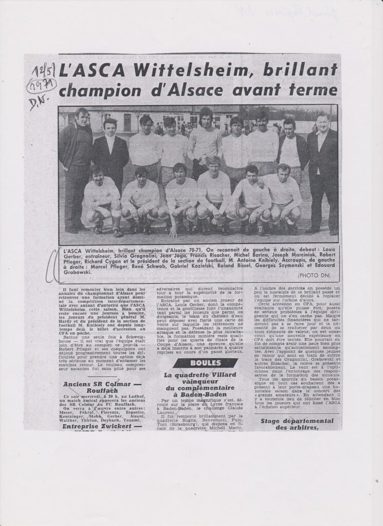 - En cette année 2025 où l’Asca-foot de F68310 Wittelsheim franchit le cap, « vénérable », reconnaissons-le, de ses 100 ans, il convient selon moi de penser tout d’abord qu’un club, ce ne sont pas seulement des joueurs et des matchs, mais également des bénévoles qui s’activent, discrètement, avant, pendant, après, et sans lesquels toute cette vie sportive ne serait tout simplement pas possible. L’année ne saurait se dérouler sans qu’on leur décerne le grandissime coup de chapeau commémoratif qui leur revient.