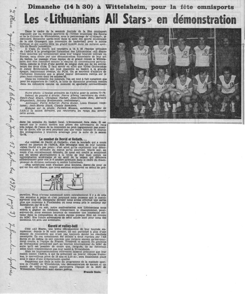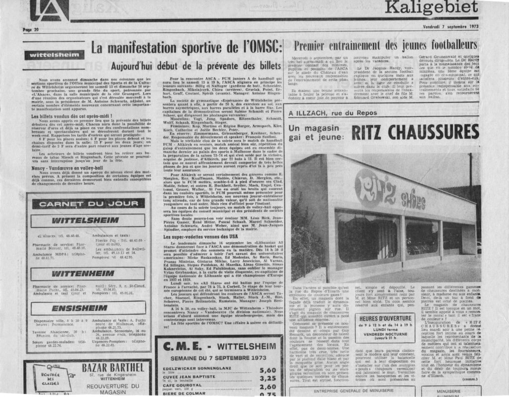 28. C’est ainsi qu’avec Pierre Albouy, secrétaire de la section de basket, et instituteur à Wittelsheim-Centre, et autre « Français de l’Intérieur » dans la potasse d’Alsace, il a organisé, mais au stade de l’asca, des tournois de basket dits « inter écoles » de Wittelsheim pour garçons et filles. Il n’y a pas à tortiller : si l’on veut une grande nation sportive, il faut la susciter, par la pratique, dès l’enfance. Pour ces instits là, c’était une évidence, et ils ont joint le geste à la parole. Et, comme l’appétit, paraît-il, vient en mangeant, tout cela est devenu une grosse affaire, on ne s’est pas contenté du basket, mais on a aussi fait des tournois de foot, et, tenez-vous bien, même de « ballon prisonnier », encore un des grands jeux de nos enfances !