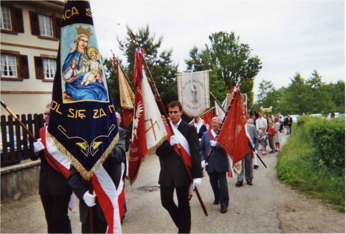 - b) De l’importance des drapeaux : ici, dense présence des drapeaux associatifs polonais au pèlerinage du lundi de Pentecôte à Thierenbach (photo Jean-Marie Schreiber).