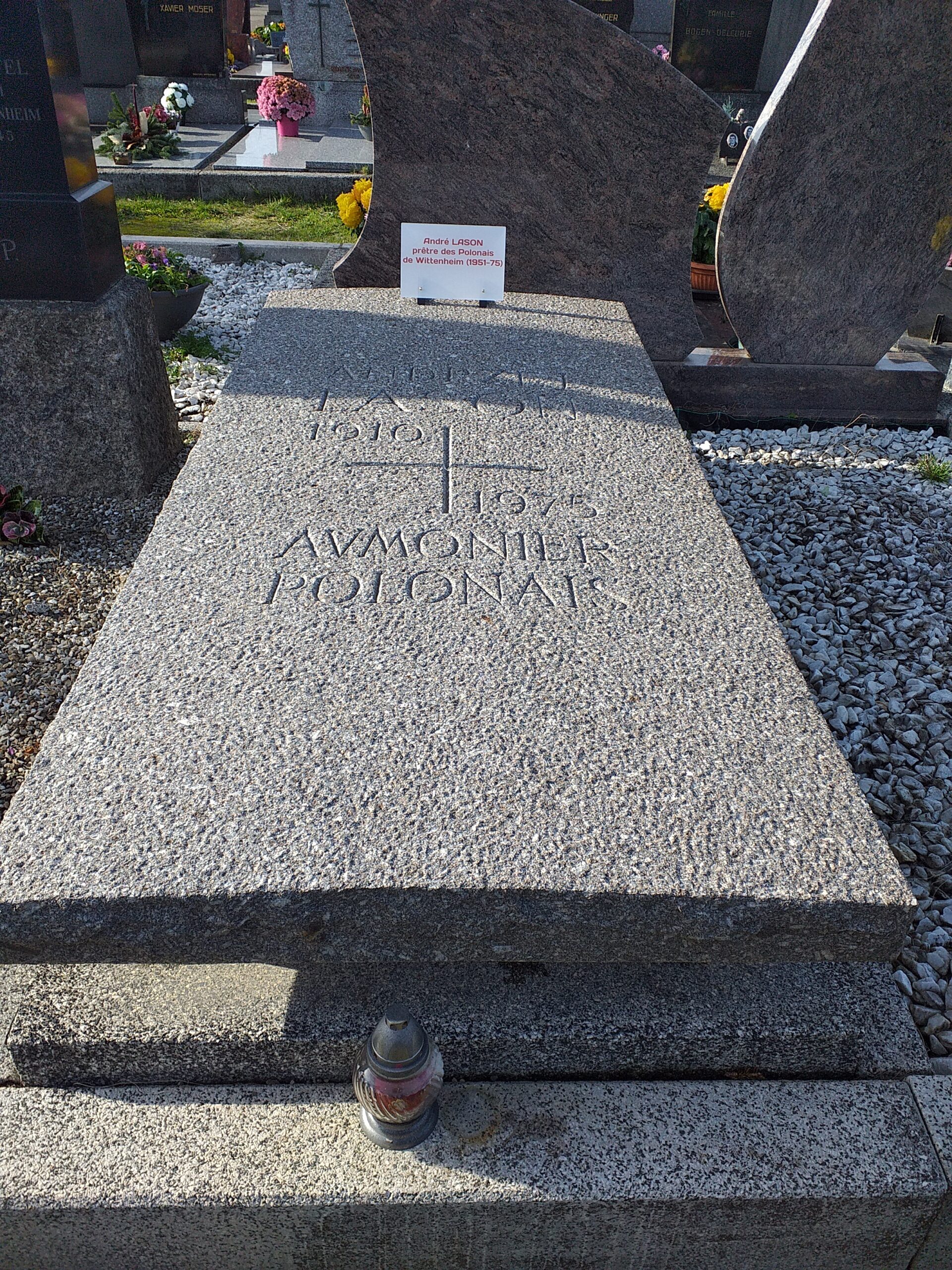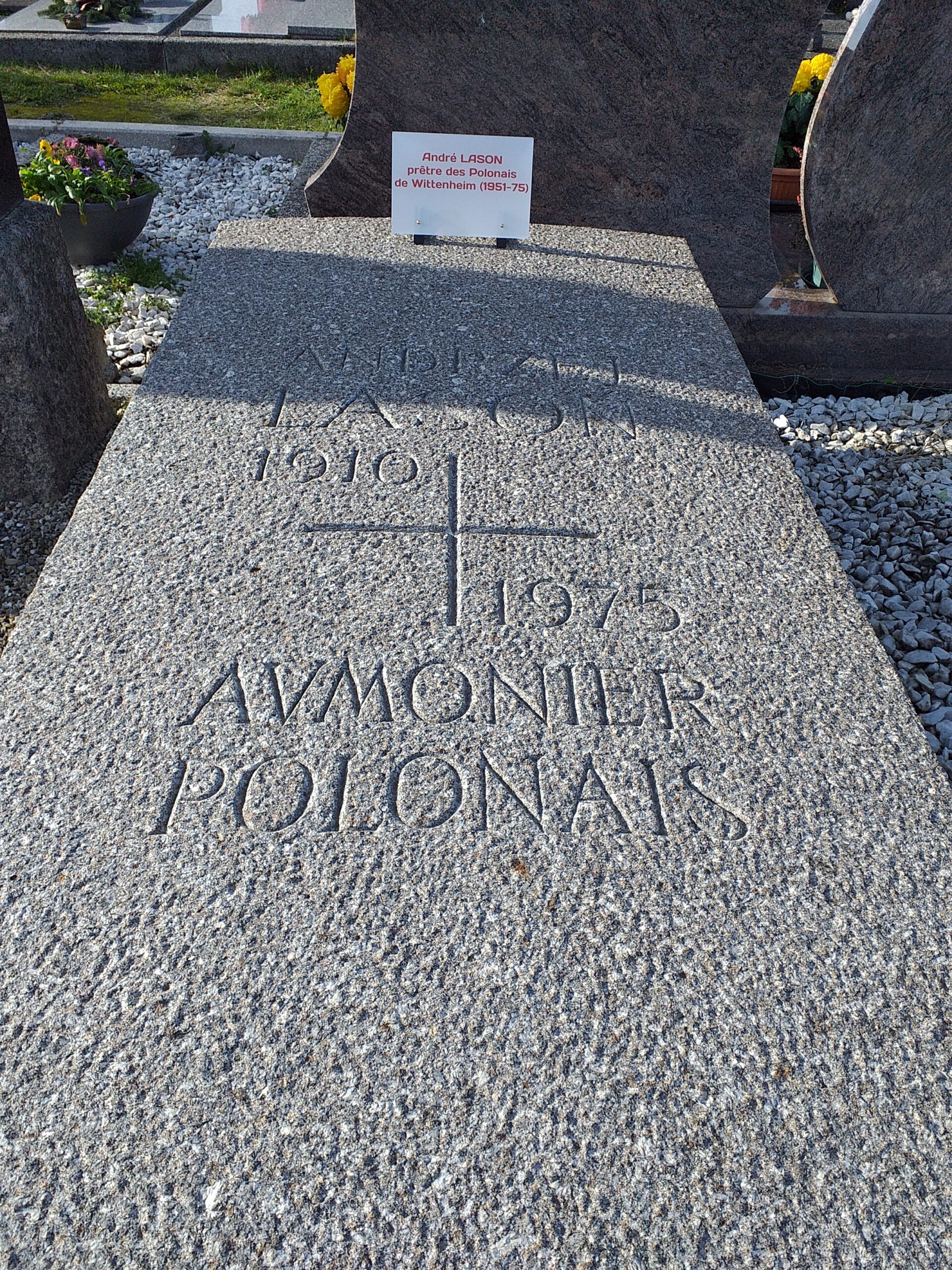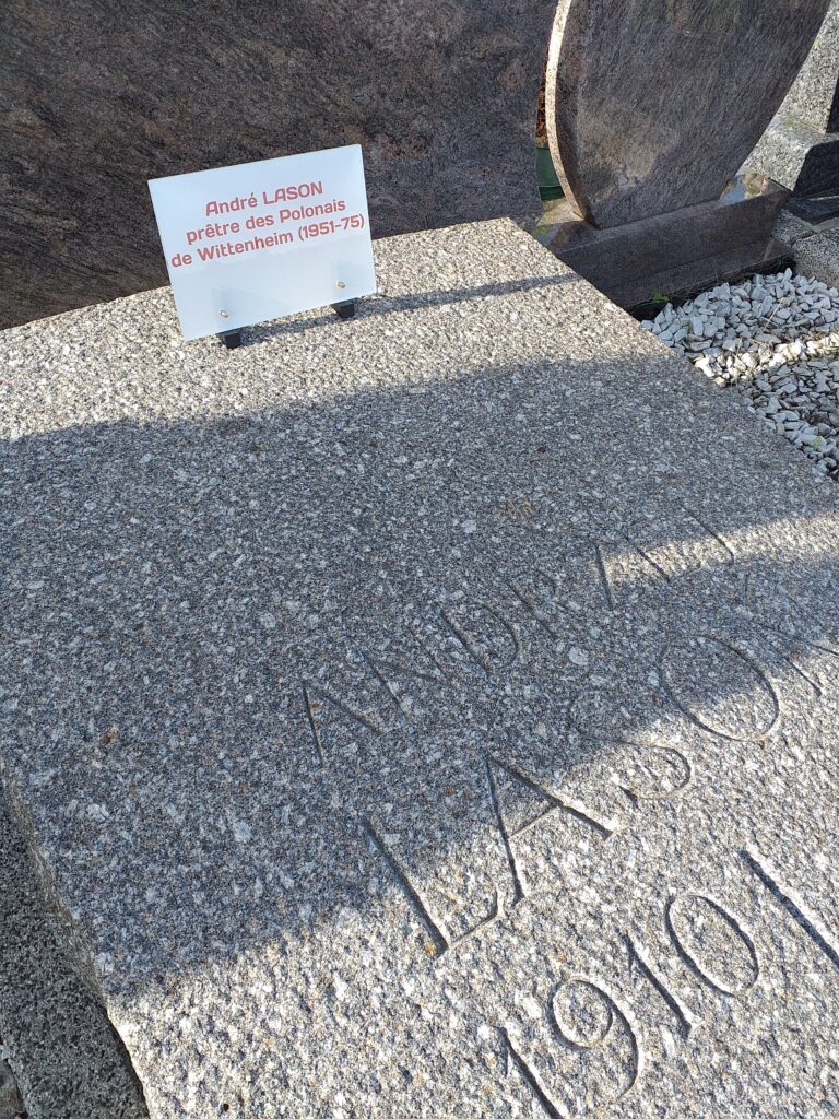 7) L’idée qui préside à l’ensemble, en amont, est que les tombes des cadres de la communauté polonaise du bassin potassique doivent pouvoir être visitées facilement, d’autant plus qu’elles sont peu nombreuses. Lesdits cadres, prêtres et instituteurs, ont été gens qui passent, et pas qui restent. Seuls deux prêtres ont leur sépulture localement, Ziolkowski à Pulversheim, et donc Lason à Wittenheim, et seuls deux instituteurs, Lorens, à Kingersheim-nord, et Lidia Kuliberda, dite « Pani », à Ensisheim, dans un casier cinéraire.