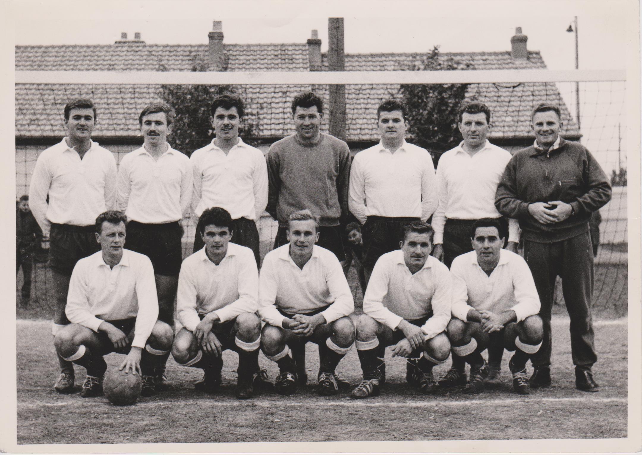 12) En guise d’illustration : photo de l’équipe première 1962-63 de l’Asca, avec Hébinger debout, en haut, premier à droite, en survêtement foncé ; un détail du cliché est repris pour notre sommaire (doc Marcel Pfleger, debout, le second à gauche, avec moustache, svp !, amical merci à lui).