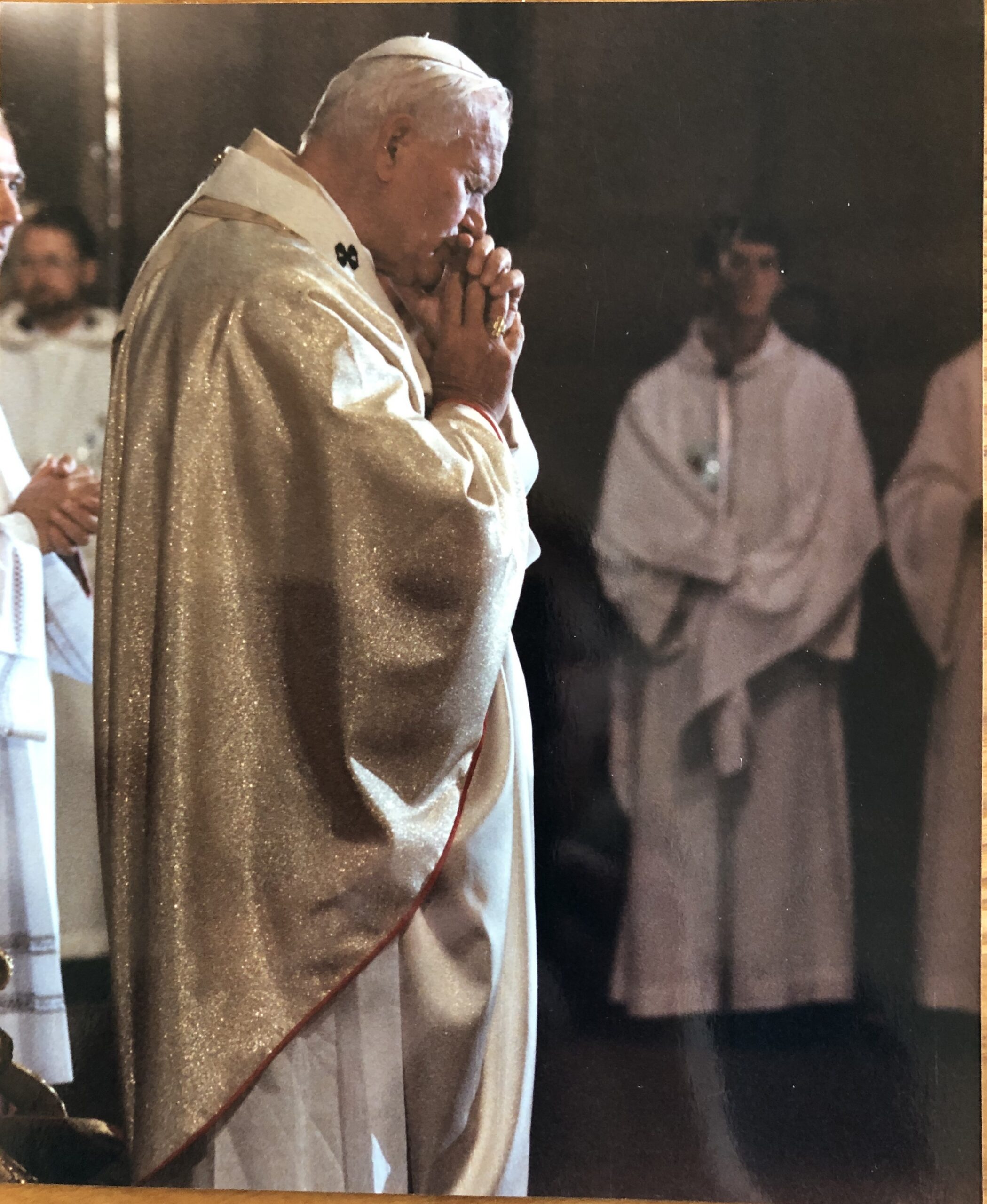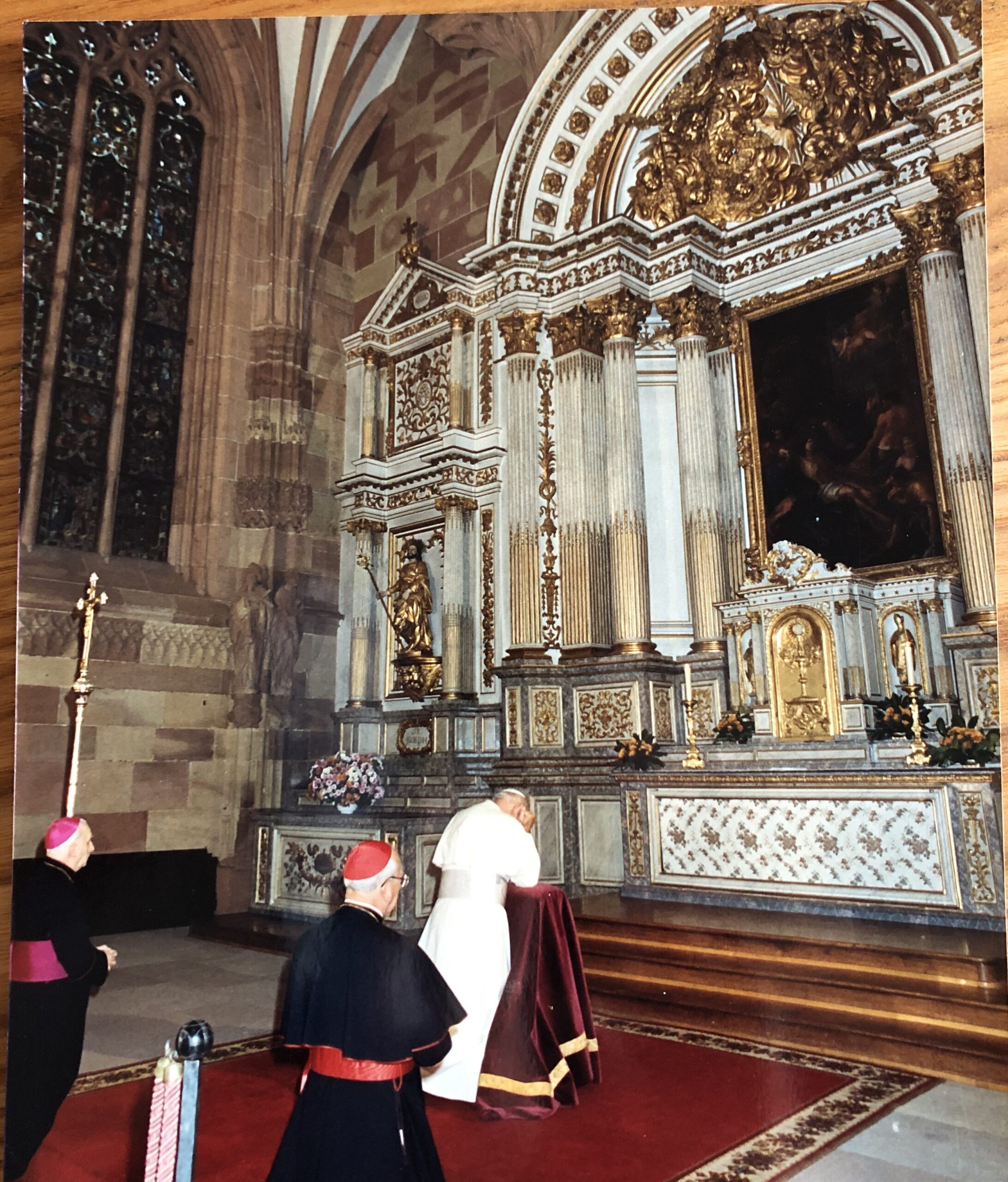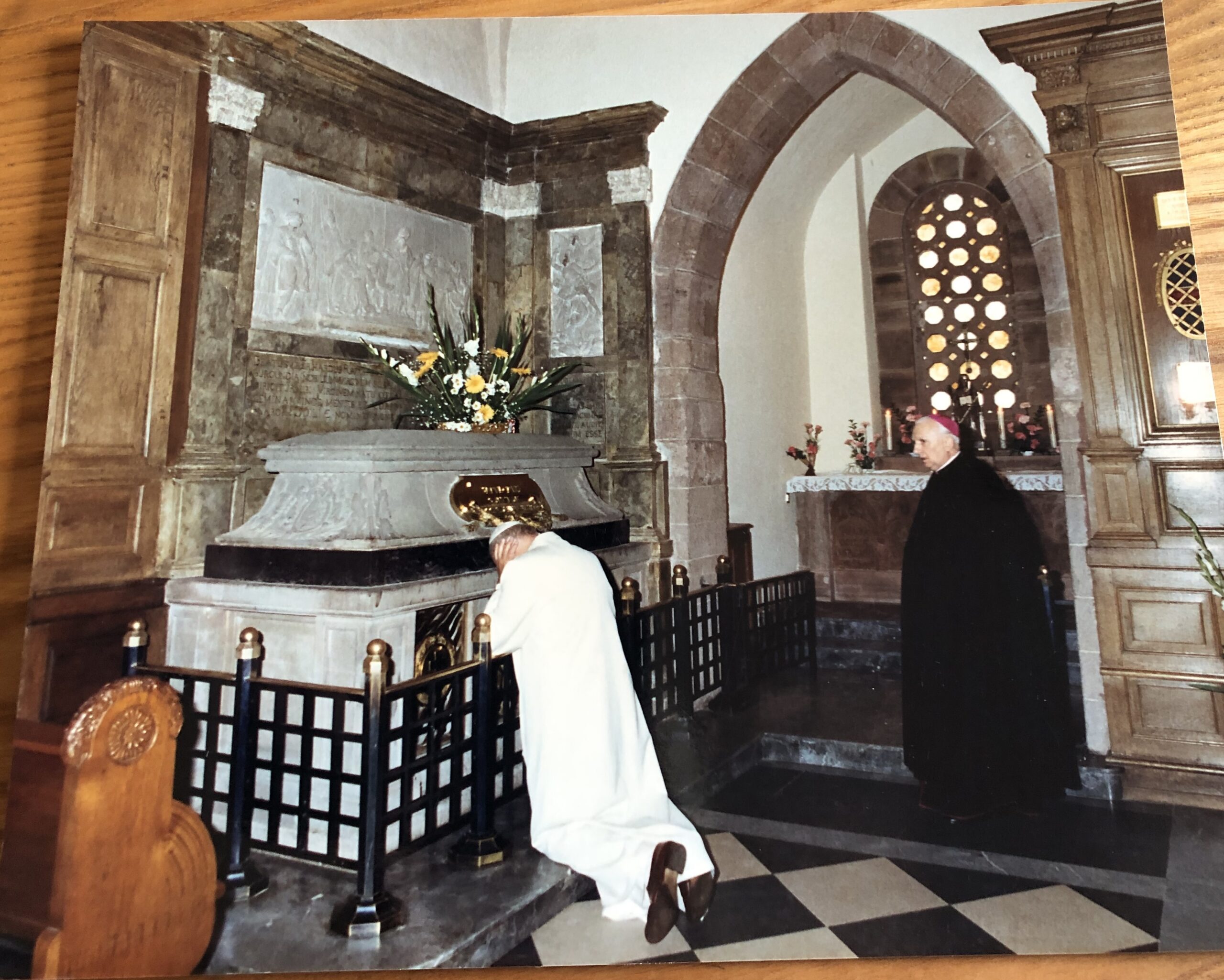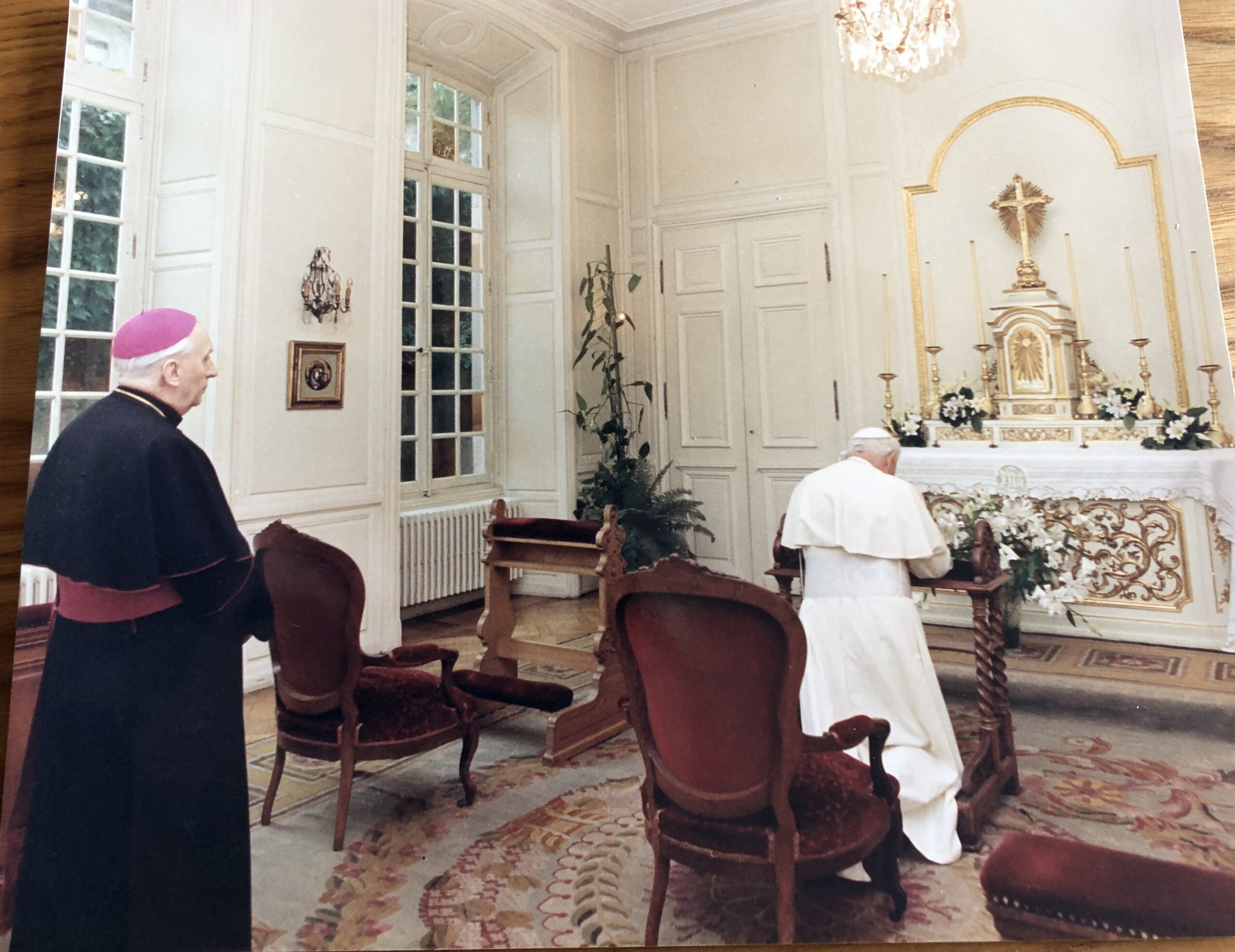 d) A son arrivée à la résidence, jp2 se recueille dans la chapelle de l’archevêque Brand, en présence de ce dernier.