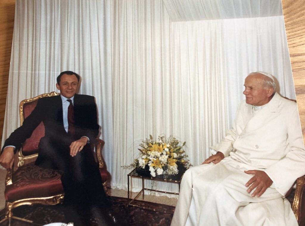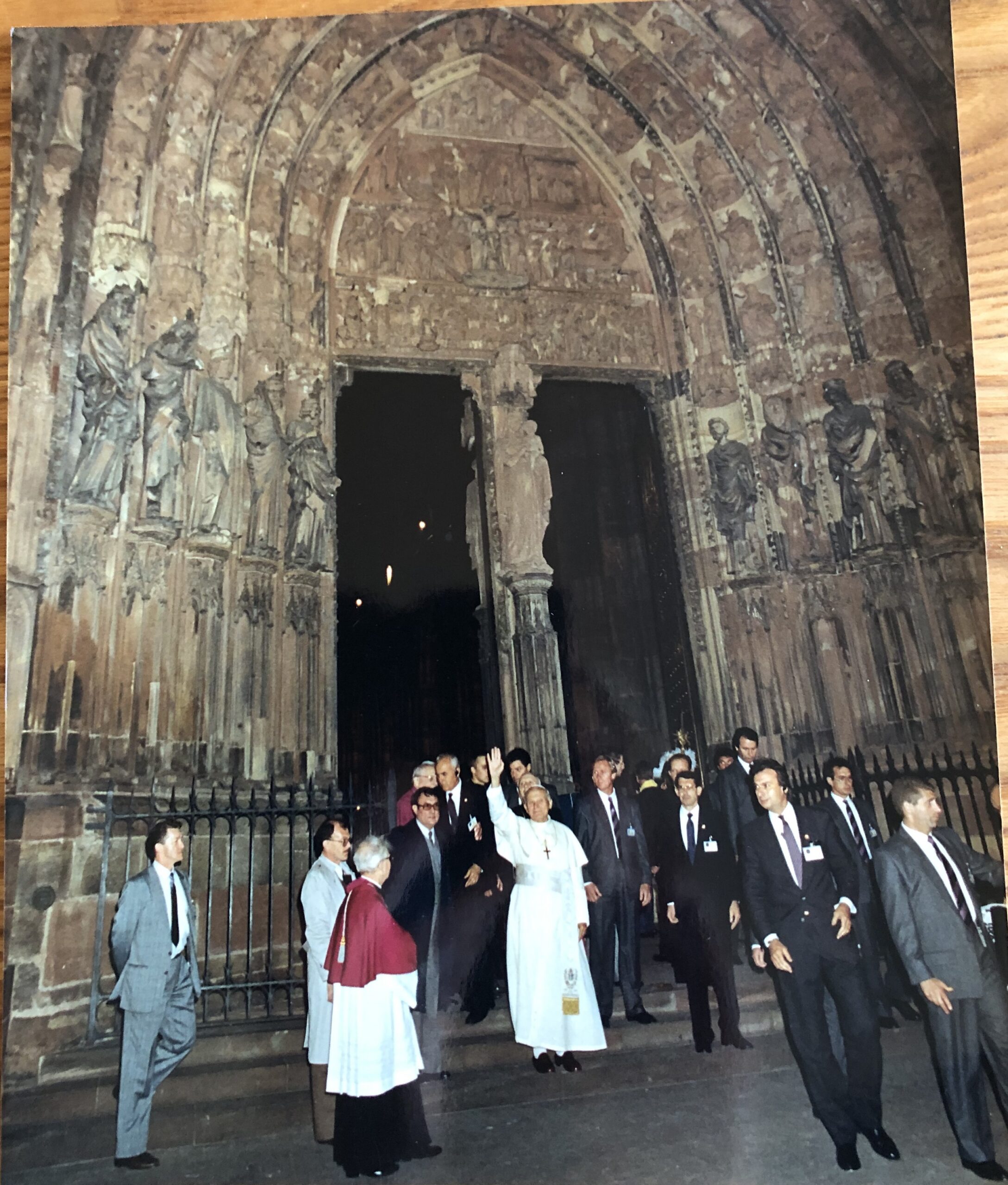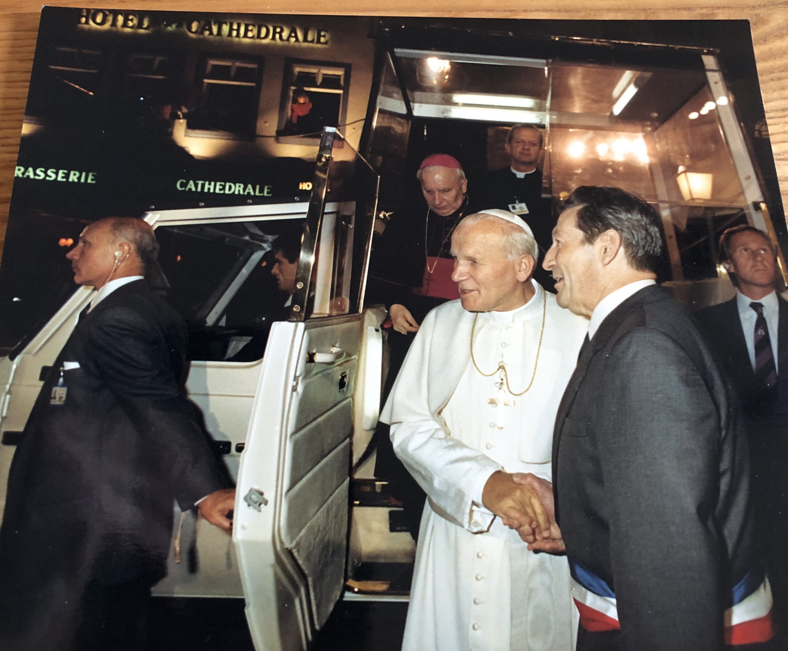 l) En soirée, jp2 participe aux fêtes du bimillénaaire de Strasbourg ; d’abord accueilli par le sénateur-maire Marcel Rudloff; au second plan, derrière Mgr Brand, le célèbre secrétaire particulier de Sa Sainteté, l’abbé Stanislas Dziwisz, qui deviendra plus tard cardinal-archevêque de Cracovie, comme l’a été son maître avant lui.