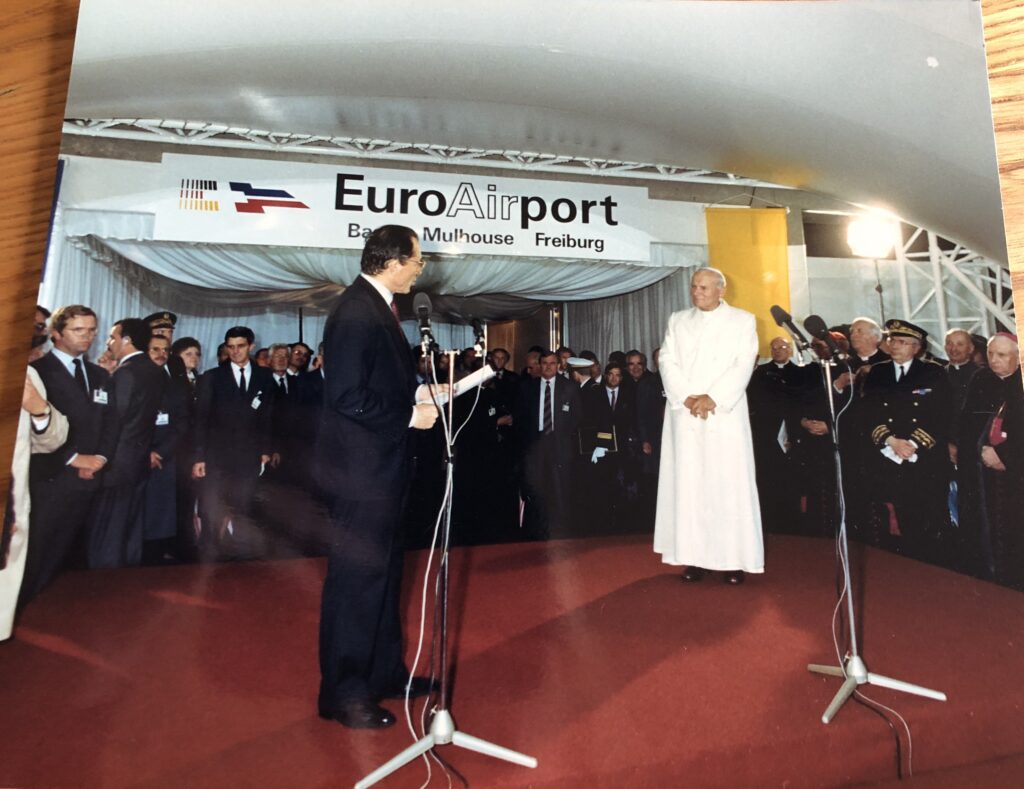 r) Le pape quitte l’Alsace par l’aéroport de Blotzheim ; il est salué par Michel Rocard.