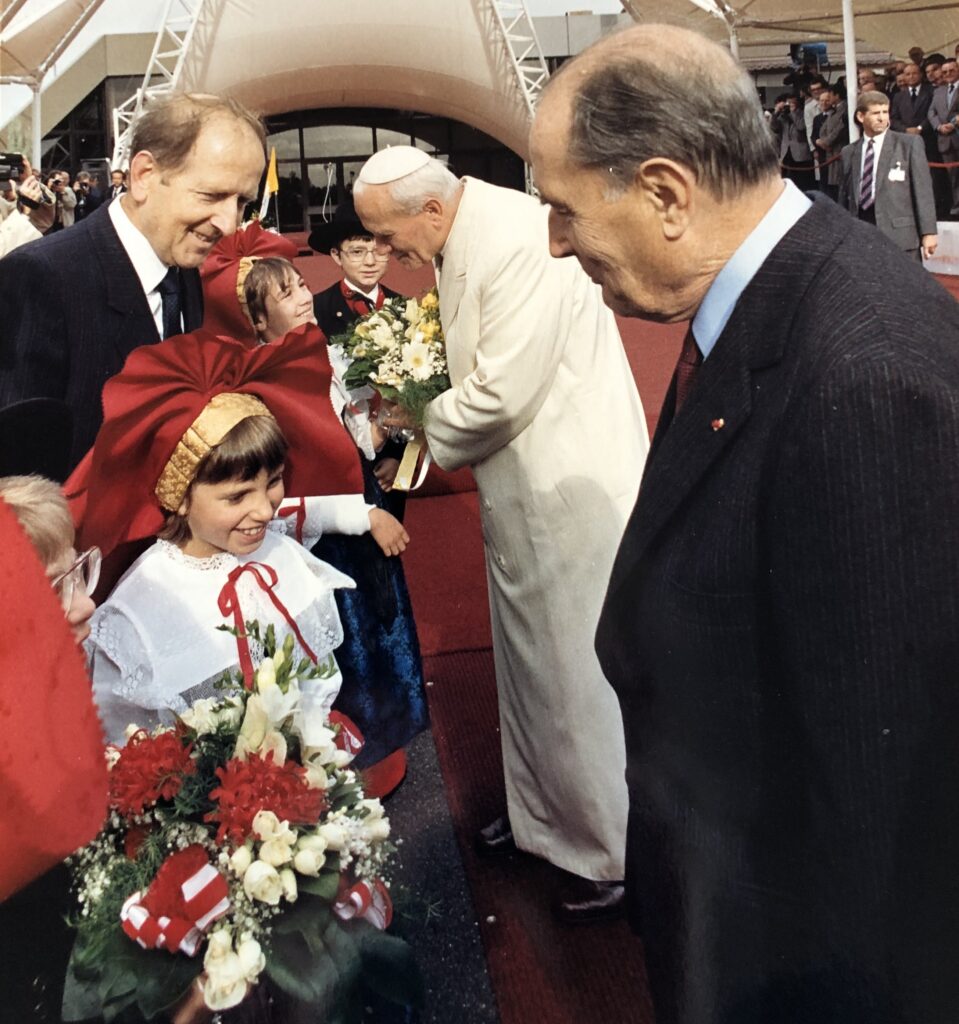 a) En sommaire, à son arrivée sur le sol alsacien, le pape, le président, et les accueillants enfants en costumes folkloriques régionaux, présentés par Hubert Védrine, alors porte-parole de la présidence de la République française, et futur ministre des Affaires étrangères.