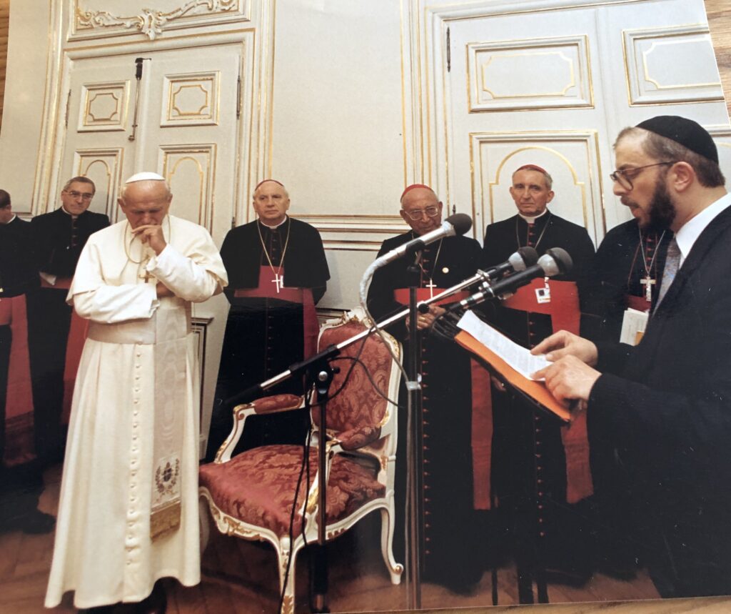 k) Le moment du dialogue interreligieux: le Grand Rabbin de Strasbourg et du Bas-Rhin René Gutman s’adresse au Saint-Père… et à ses accompagnateurs… dont le cardinal français d’origine polonaise Jean-Marie Lustiger, juif converti…