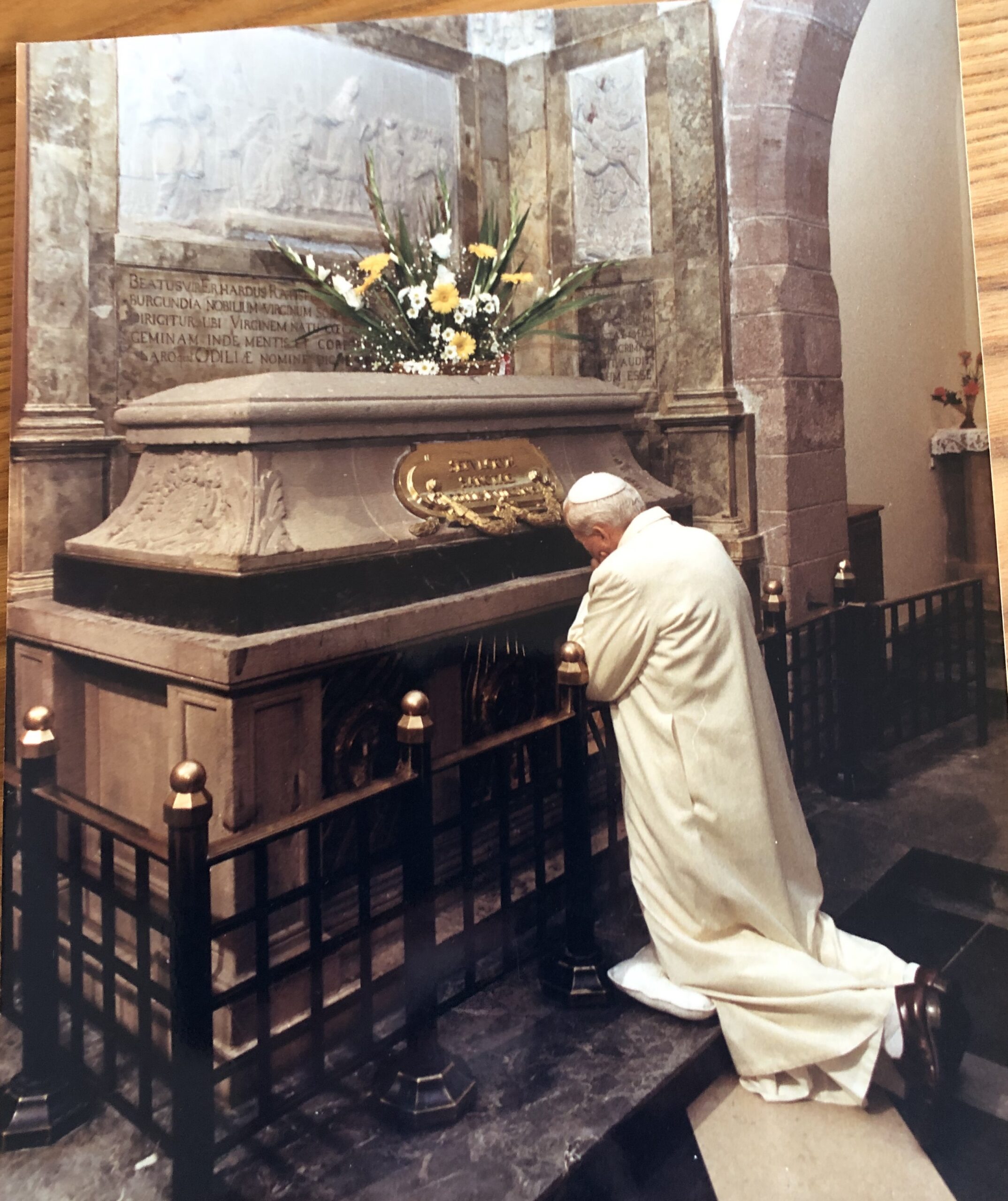 p) Au Mont Ste-Odile, tôt le matin, le pape prie devant le tombeau de la sainte patronne de l’Alsace, en présence de l’archevêque.