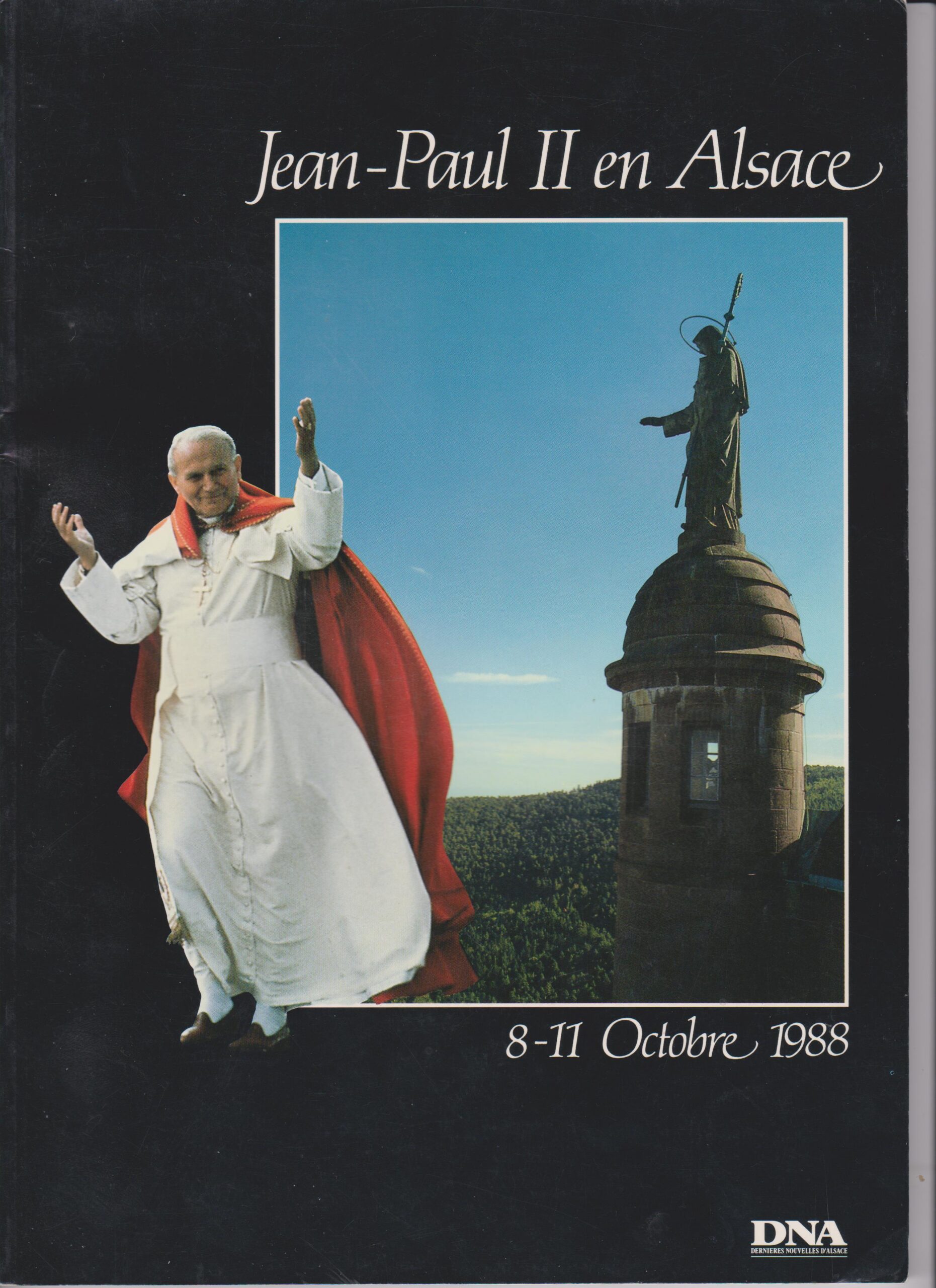4) En prolongement instructif de cette série de clichés, on ira à l’album-souvenir du voyage élaboré par les DNA, aux éditions de La Nuée bleue, 4ème trimestre 1988, 80 pages ; ici, la 1ère de couverture de ce fascicule, qui vaut en outre par un dossier bien « potassé » sur le catholicisme en Alsace.
